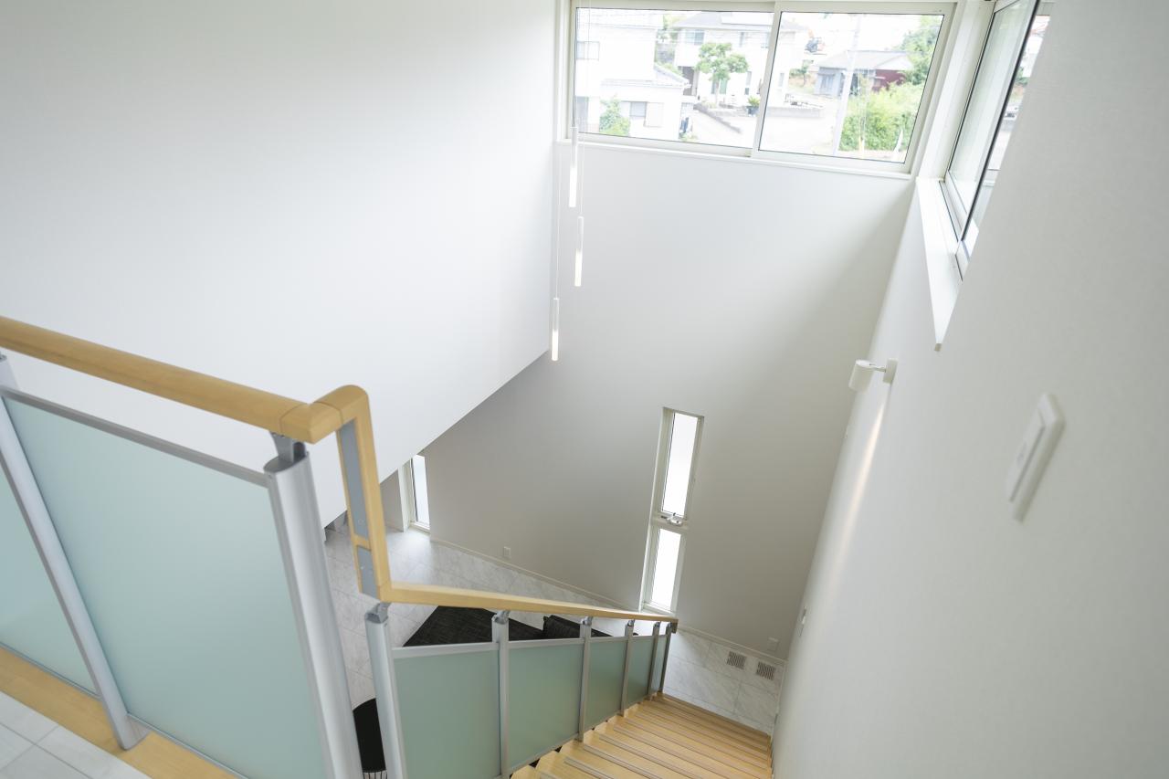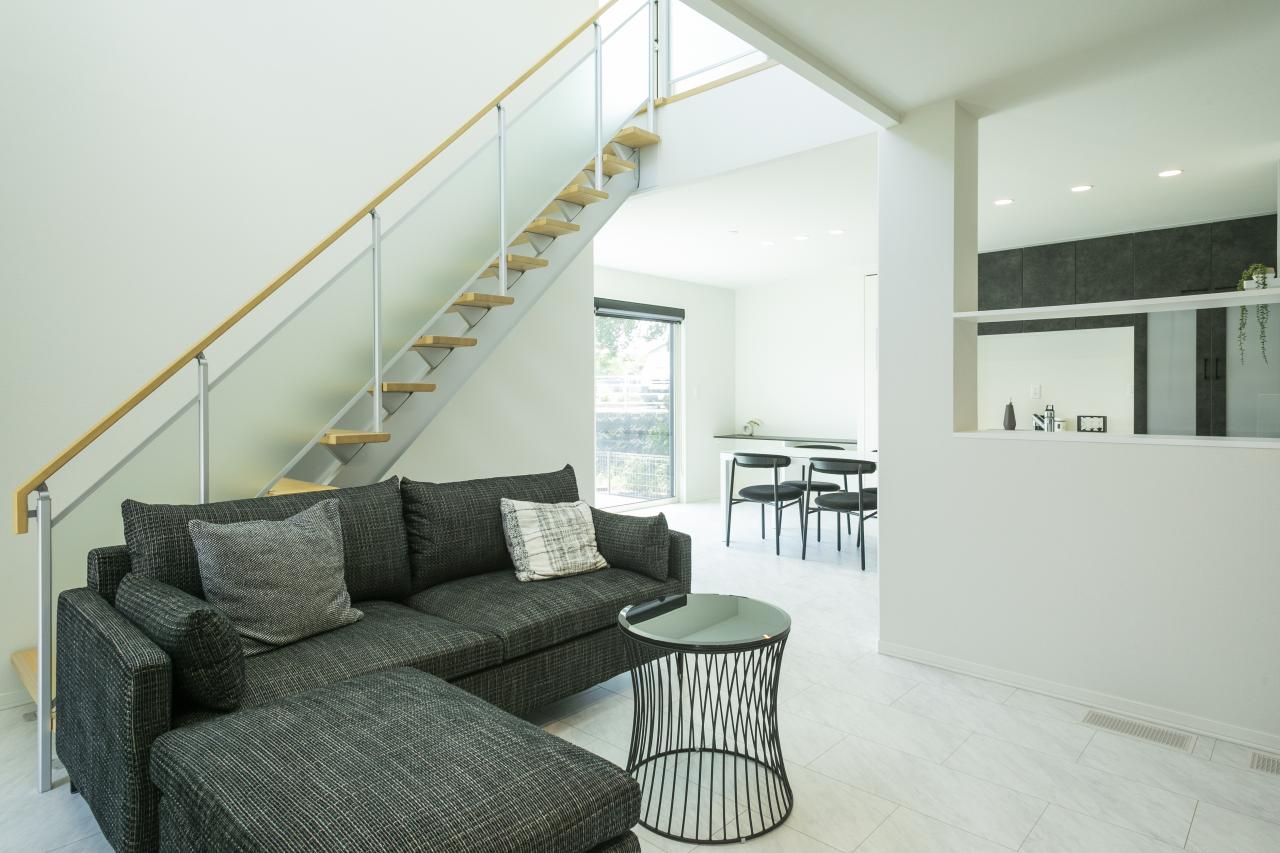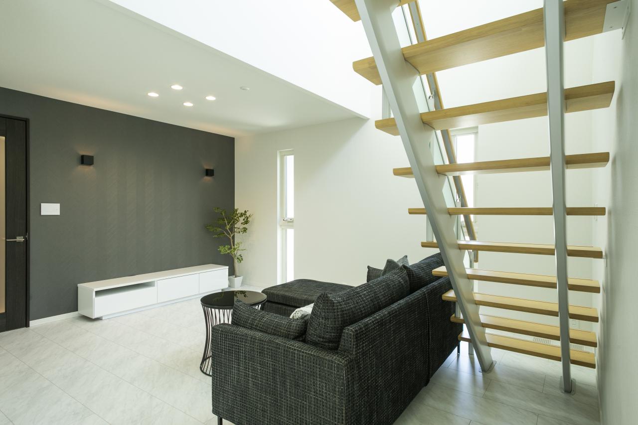 オープン階段と吹き抜けにより解放感のあるリビング