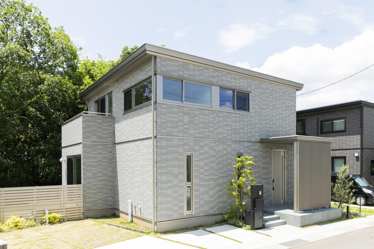 グレータイル外壁と化粧格子が演出する高級感