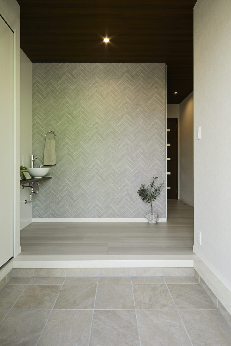 玄関ホールはアクセントクロスでフォーカルポイントを創出。コロナ禍でのニーズを反映してオシャレな手洗い器を設置しました。