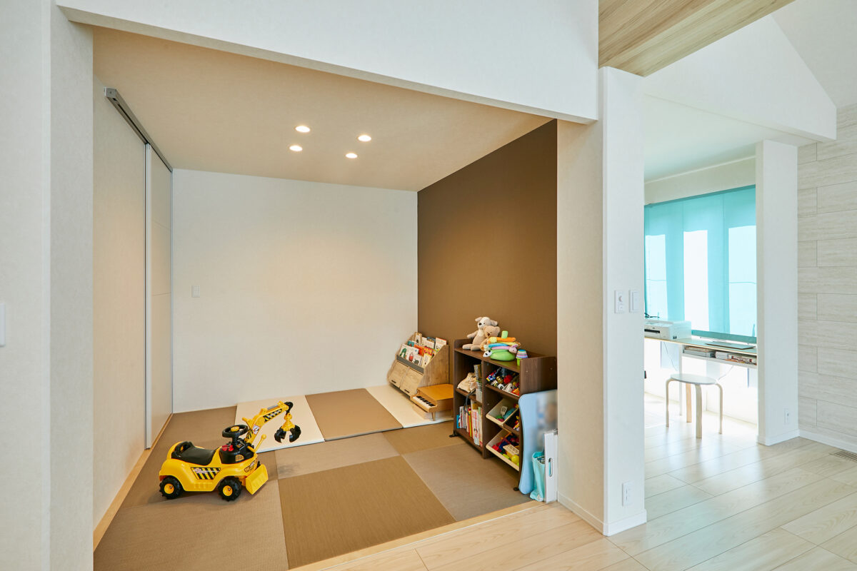 リビングとつながるフレキシブルスペース。キッチンからも見通せる和室は、お子さまたちが遊んだりお昼寝したりと、安心便利に使える空間です。