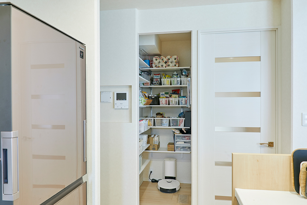 奥さまのご要望でキッチンに直結のパントリーを配置しました。