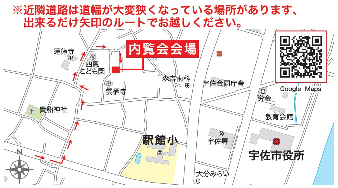 ※近隣道路は道幅が大変狭くなっている場所があります、できるだけ矢印のルートでお越しください。(地図画像参照)