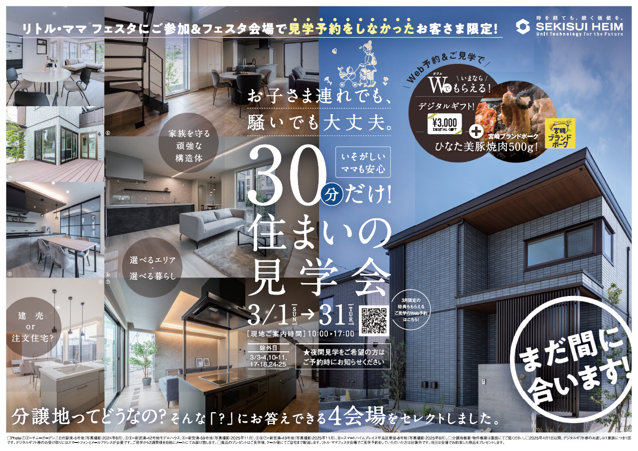 イベント情報 EVENT 開催予告 【3/1(日)~3/31(火)】\リトル・ママフェスタにご参加&フェスタ会場で見学予約をしなかったお客さま限定/いそがしいママも安心 30分だけ!住まいの見学会 開催期間 2026/03/01 〜2026/03/31 時間 10:00~17:00 お気に入り登録 申し込みをする イベントが開催される分譲地 スマートハイムプレイス早良区重留 福岡県福岡市早良区重留7丁目 詳細を見る 見学予約をする サニーガーデン二日市駅東 福岡県筑紫野市二日市北7丁目 詳細を見る 見学予約をする 新宮湊 福岡県糟屋郡新宮町大字湊 詳細を見る 見学予約をする 香椎の宮ヒルズ 福岡県福岡市東区香椎2丁目 詳細を見る 見学予約をする 戻る