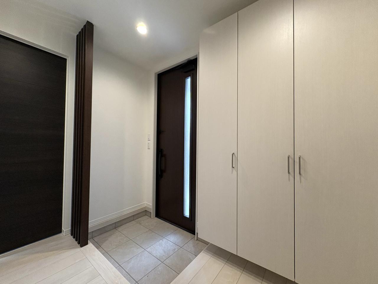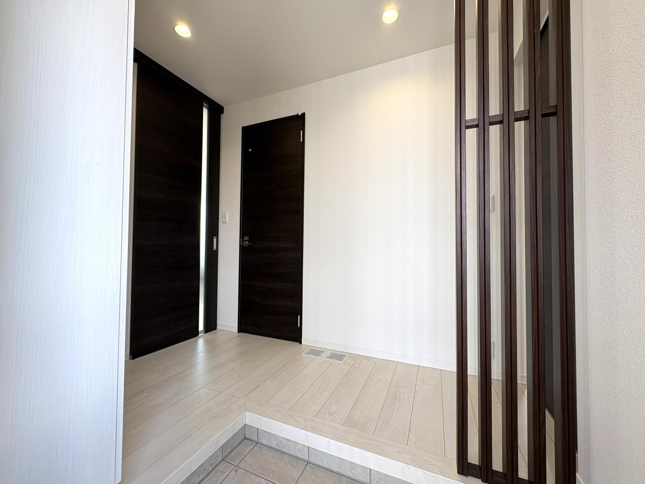 フラットルーフのモダンな存在感と化粧格子がアクセント