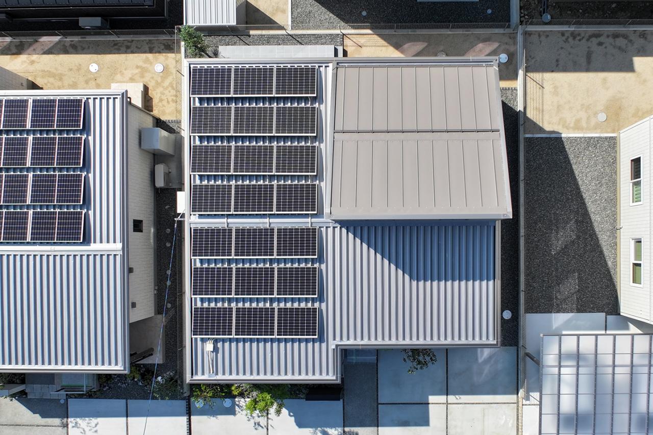 鉄骨系住宅 蓄電池◆12kWh ジオマイト外壁 太陽光発電システム◆5.56kW 快適エアリー HEMS エコキュート オール電化 バリアフリー ZEH 対面キッチン 南面LDK 食洗機 宅配ボックス リモコンキー 小屋裏 家まるごと仕様 浴室乾燥機 脱衣室と洗面室が別 3台駐車場 タイルテラス