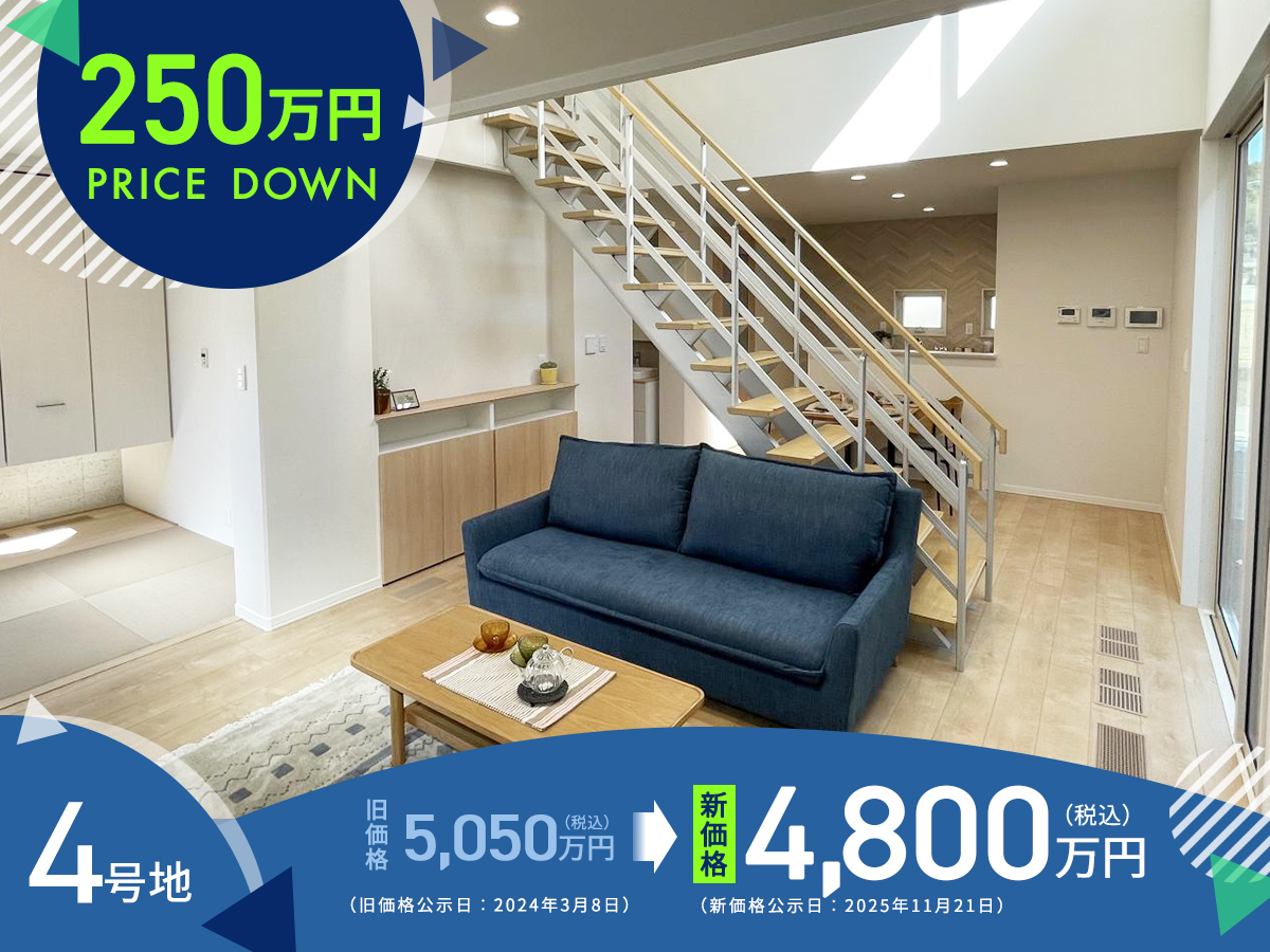 《分譲地概要》【総面積】780,72m2【開発行為】無【都市計画】非線引き地域【高さ制限】無【壁面後退】無【地区計画】無【街区・地区等】屋外広告物第3種制限地域、埋蔵文化財包蔵地、景観計画区域、宅地造成等工事規制区域【造成工事】完了済【開発負担金】無【共有地施設負担金等】無【組合費】無【CATV加入条件】無【管理組合】無【ガイドライン】有【完成年月】2023年5月(4号地)2024年10月(2号地)【建物構造】鉄骨造/2階建て(4号地)鉄骨造/平屋(2号地)■プラン中の外構及び植栽、屋外の給排水工事費、特殊基礎、水道加入金及び下水道受益者負担金、屋外の電気工事費は価格に含まれております。■ローン手数料・登記料及びその他の諸費用は別途となります。■プラン掲載の車両及び応接セット、ダイニングセット、ベッド、座卓などの家具調度類はイメージです。記載の価格には含まれておりません。