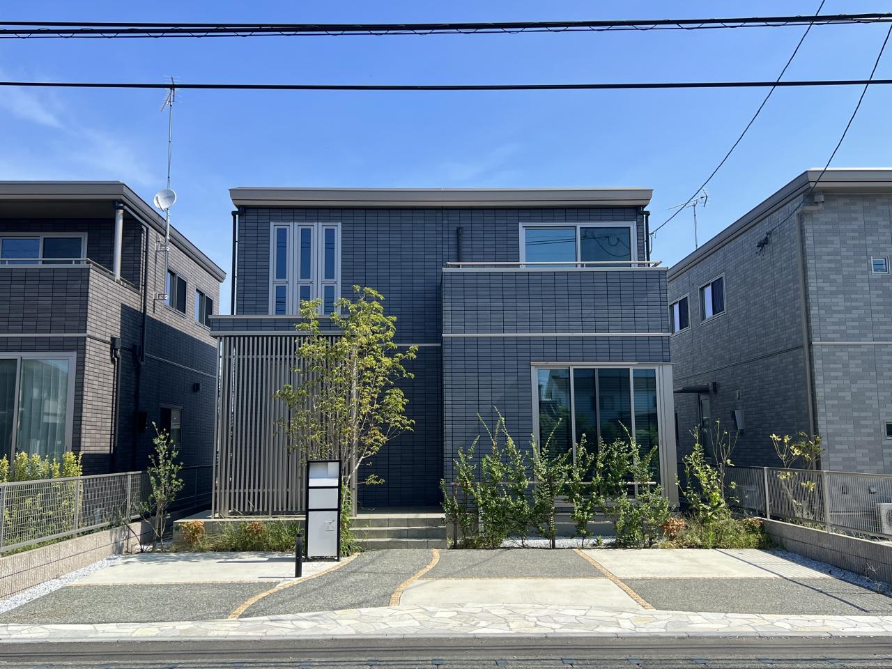シックなタイル外壁と格子が高級感を一層演出