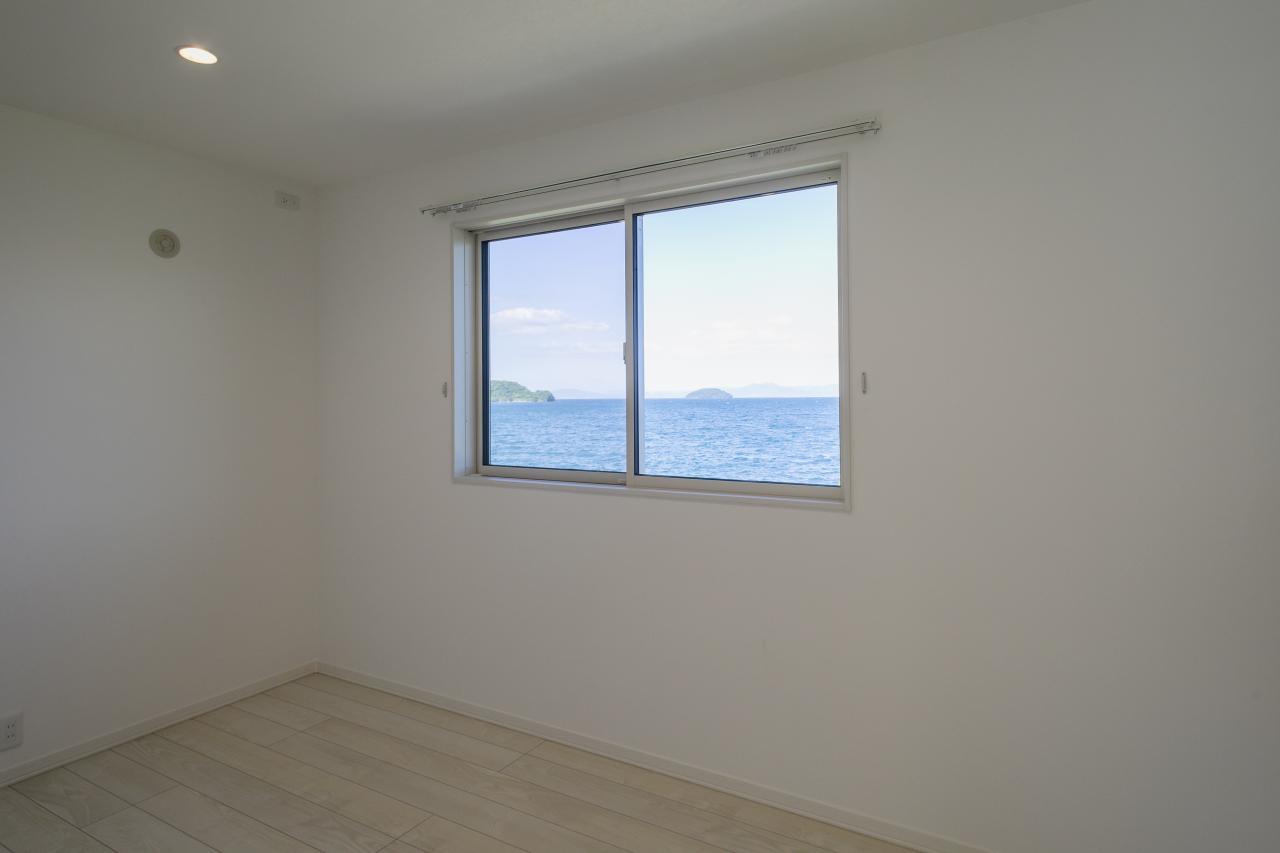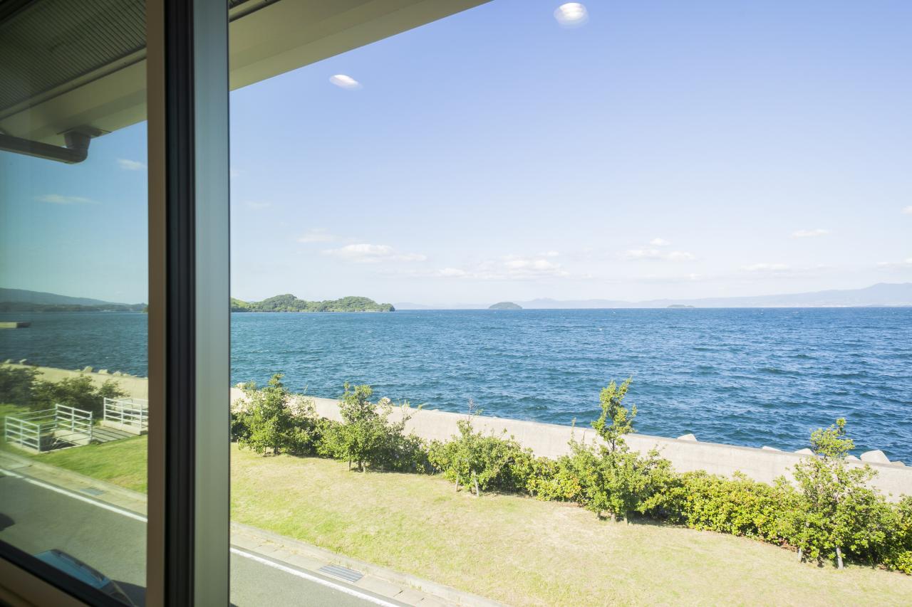 傾斜天井と海の眺望で開放的な2階のフリースペース