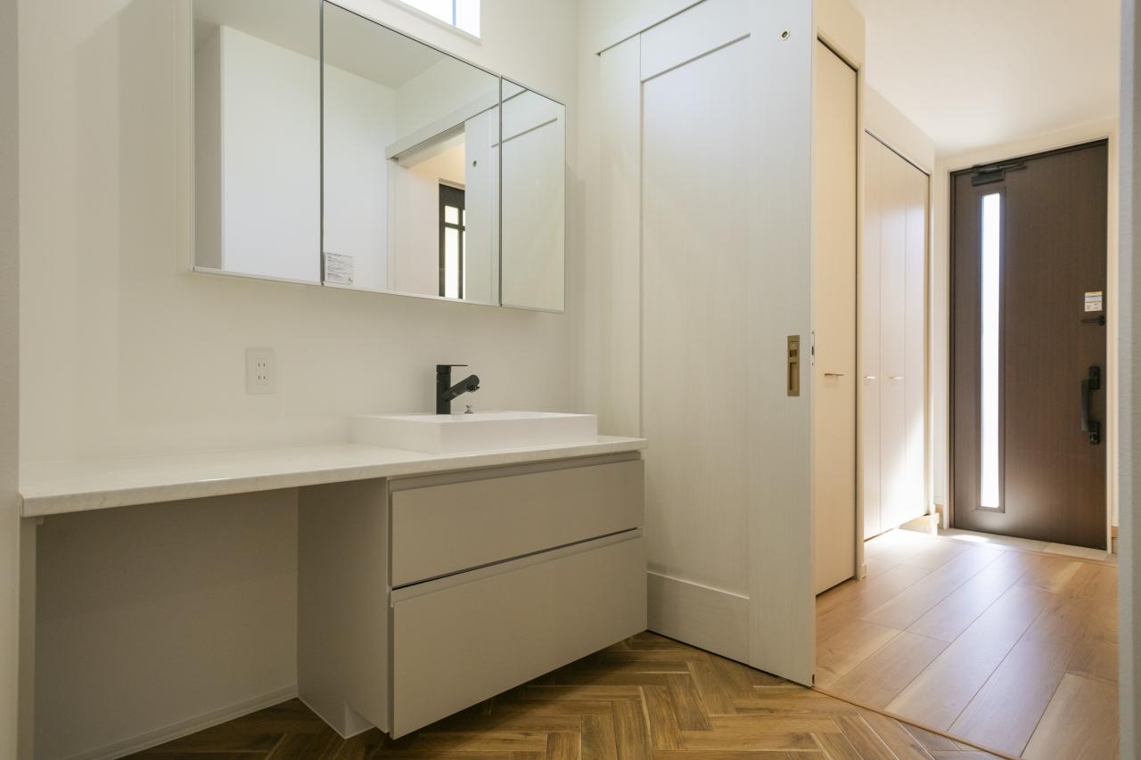 洗面横の広々したカウンターは朝の身支度を快適に