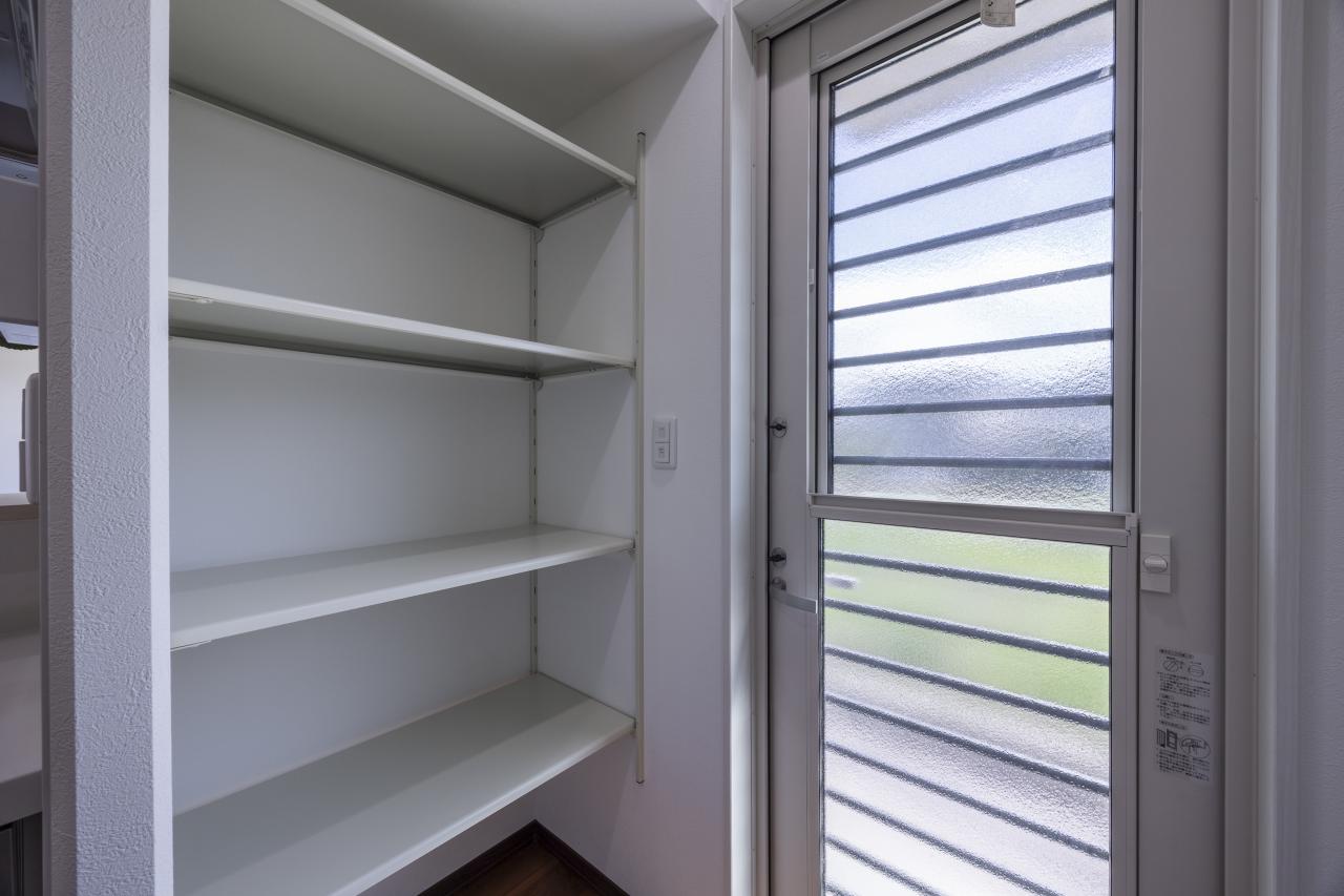 ストック品も隠して収納できる勝手口付きのパントリー