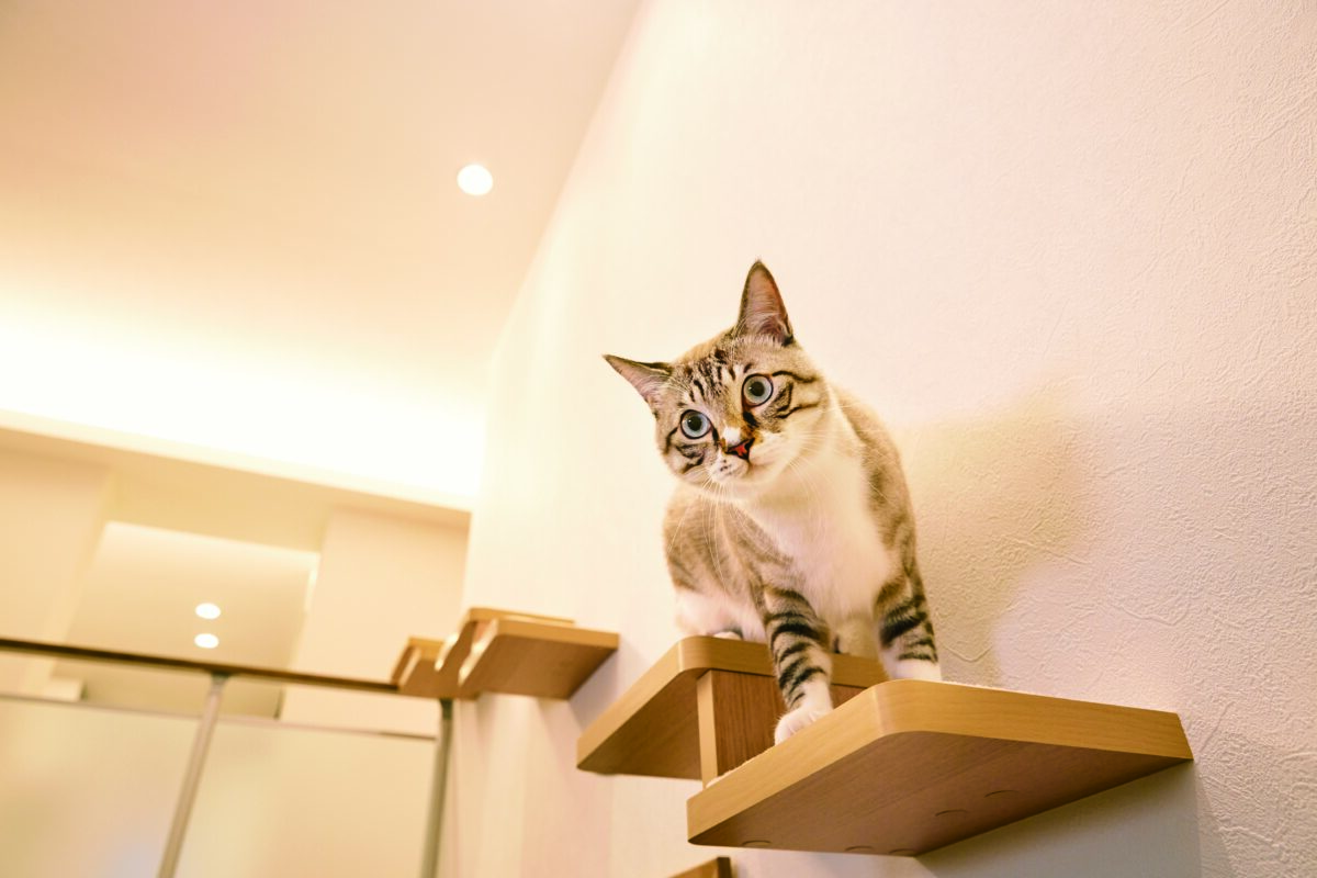 猫は上下運動が大好き!壁にキャットウォークを配置すれば、室内でもたっぷり運動ができるフィットネス場に!リビングの壁や吹き抜けに設置することで、人のいる場所と猫の遊び場が共存。木目や壁紙と合わせることでおしゃれなインテリアにもなじみます。