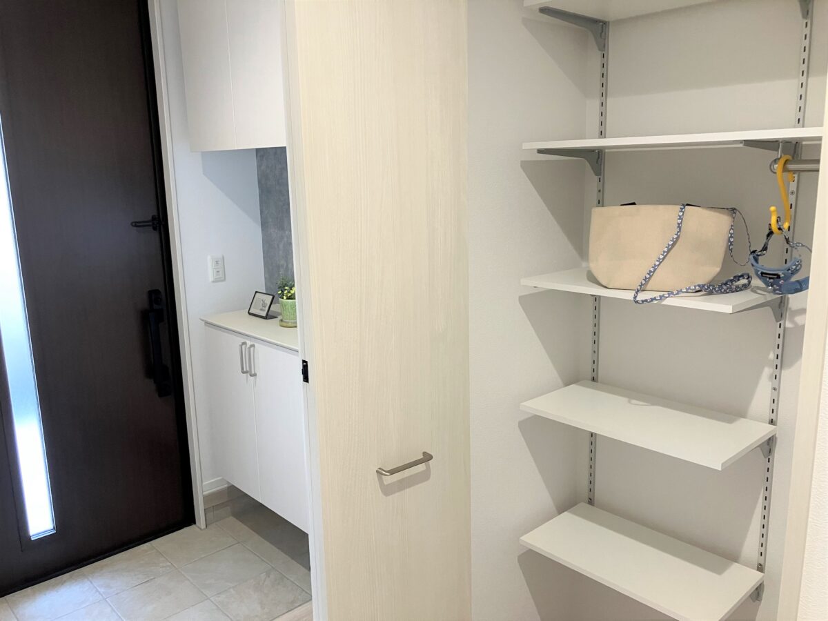 あれこれ探して玄関を行ったり来たり、なんてことありませんか?そんな時に便利なのが、お散歩グッズ専用の玄関収納。必要なものをまとめておける可動棚付きの玄関収納や、フック付きの壁面収納があると、出発前と帰宅後の準備・お片付けもぐんとスムーズに。汚れたグッズを一時置きできるスペースを設けるのもおすすめ。