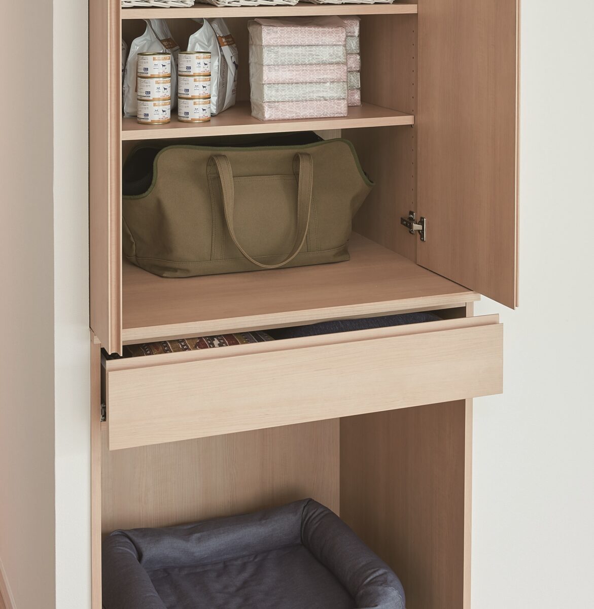 人間だって、自分の部屋があるとうれしいもの。それはペットも同じです。ベッドや食事や飲み水、トイレシートなどを置くペットコーナー。家族の気配を感じつつ、落ち着ける場所に自分だけのテリトリーをつくってあげましょう。リビングの一角や窓際の陽だまりスペースなんて最高です。毛や食べこぼしが出やすいので、掃除しやすいタイルの床や、消臭機能のある壁紙を併用するのもおすすめ。上部に収納を設けると、ごはんやおもちゃ、お手入れ用品や掃除道具などをサッと取り出せて便利です。