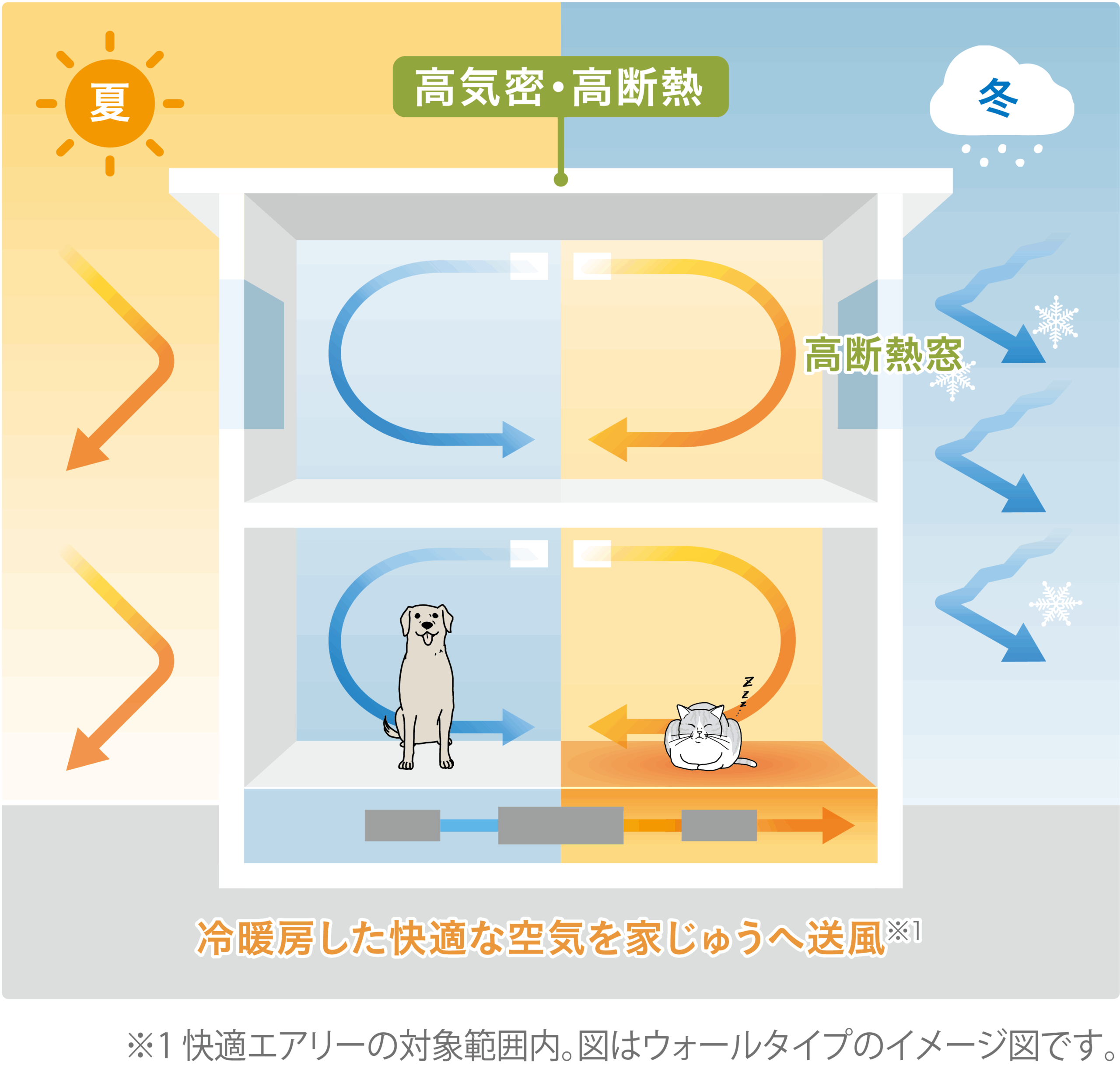 人よりも暑さ・寒さの影響を受けやすく、体温調節も苦手なペット。不適切な空調管理が命に関わることも。そんな「言葉にできない」彼らのために、夏の熱中症や冬の低体温症を防ぐために、留守中の空調管理も大切。セキスイハイムの高気密・高断熱の躯体と独自の空調システム快適エアリーT-SASなら、夏も冬も家じゅう※1 心地よい環境に。機械で給気と排気をコントロールする第一種換気で、いつでもクリーンな空気に。また、太陽光発電システムと併用することで、空調の使用頻度が高くても家計にやさしく過ごせたり、万が一の時に家族みんなが安心できる「備え」になります。