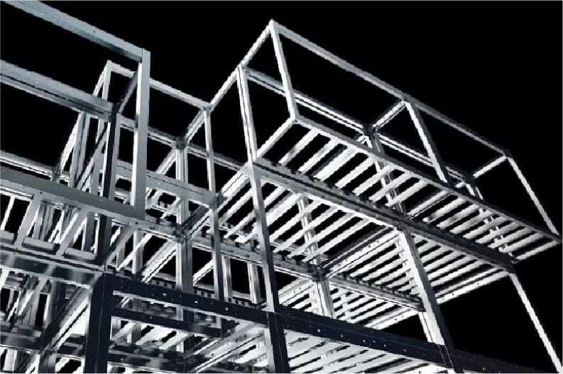 高層ビルの多くに採用される「ラーメン構造」を応用、柱と梁を溶接で一体化した鉄骨シェルターのようなユニット構造体。その強さは、工場ならではの技術によって支えられています。
