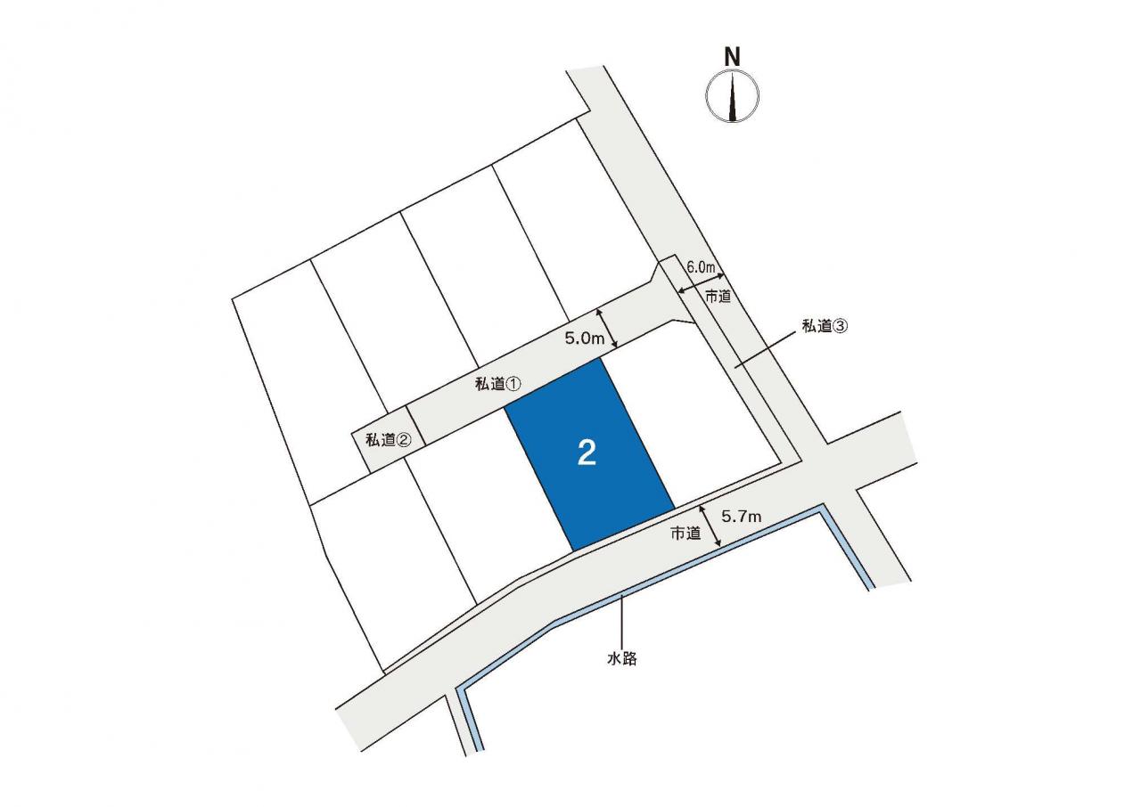 - 私道幅員5.0m、私道負担面積①169㎡、持分1/8(1号地~8号地)②40㎡、持分2/5(5号地)、持分1/5(6号地)③75㎡、持分1/9(1号地~8号地、事業主)